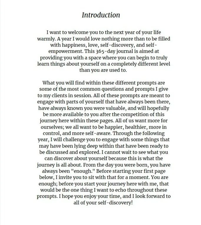 Over the nearly 10 years I have been a licensed clinician, certain questions get repeated. I decided to take all of my most common questions I ask in real therapy session to work for me here in this journal. Each page gives you a prompt I have given a client along the way. I look forward to how this journal can help you on your mental health journey. You are also more than welcome to join my newsletter for updates on new projects, articles, and posts.